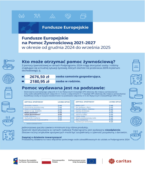 W programie Caritas w okresie od grudnia 2024 do września 2025 objęto pomocą 257 osób. Wydano ogółem 9703,27 kg żywności o wartości 70080,1 zł